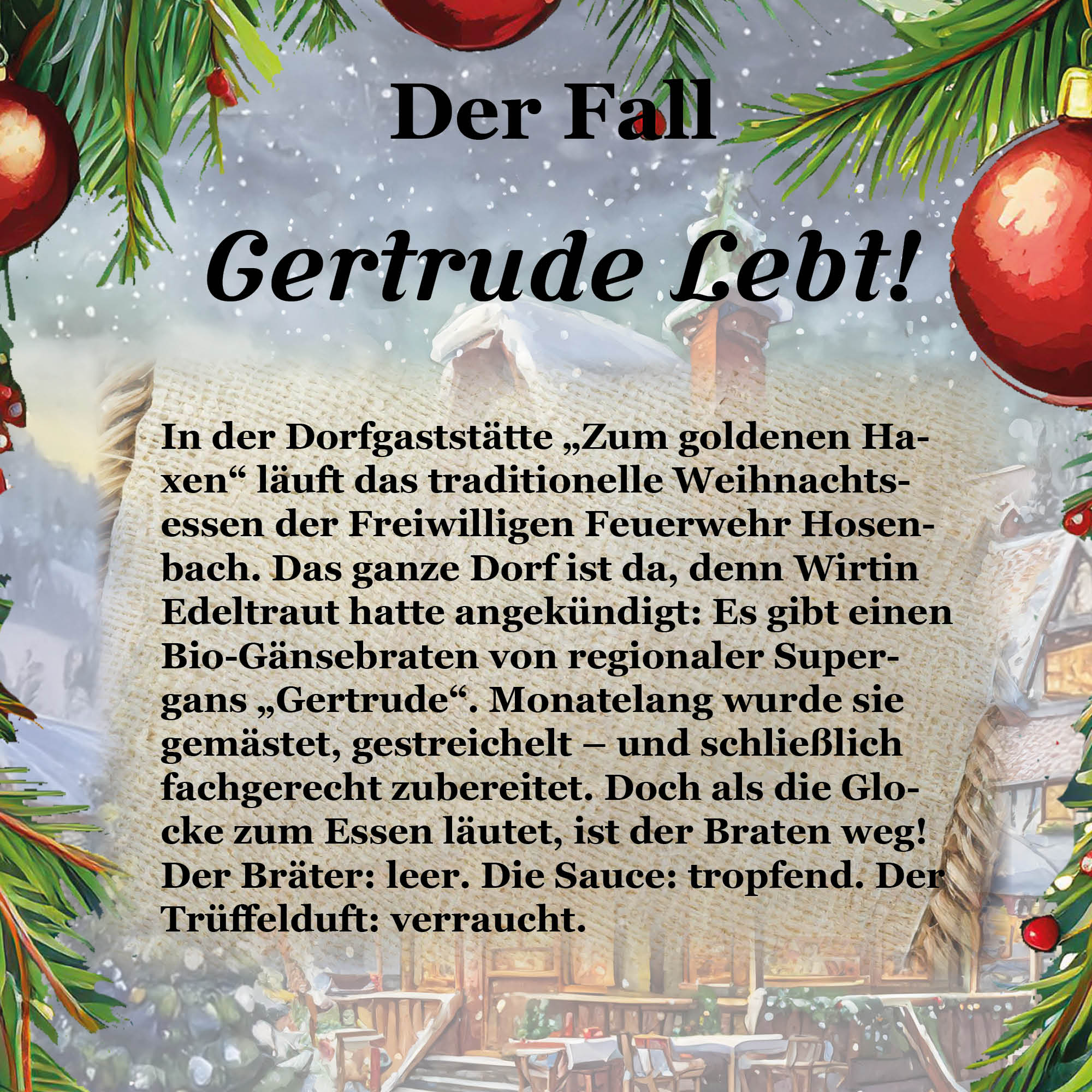 In der Dorfgaststätte „Zum goldenen Haxen“ läuft das traditionelle Weihnachtsessen der Freiwilligen Feuerwehr Hosenbach. Das ganze Dorf ist da, denn Wirtin Edeltraut hatte angekündigt: Es gibt einen Bio-Gänsebraten von regionaler Supergans „Gertrude“. Monatelang wurde sie gemästet, gestreichelt – und schließlich fachgerecht zubereitet. Doch als die Glocke zum Essen läutet, ist der Braten weg! Der Bräter: leer. Die Sauce: tropfend. Der Trüffelduft: verraucht.